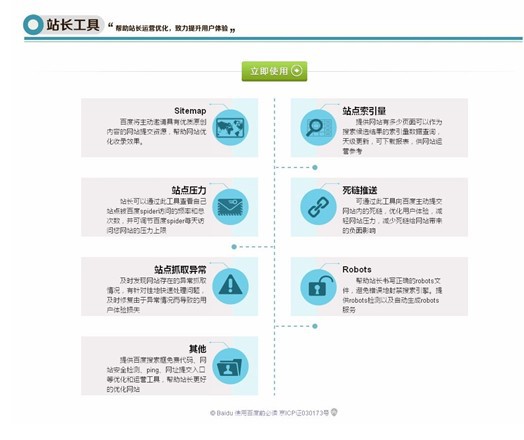 站長(zhǎng)可以通過工具區(qū)提供的死鏈推送、站點(diǎn)索引量查詢、站點(diǎn)抓取報(bào)錯(cuò)查詢、robots工具、站點(diǎn)壓力反饋和網(wǎng)站安全監(jiān)測(cè)等功能,減輕網(wǎng)站服務(wù)器壓力,提升網(wǎng)頁抓取效率和質(zhì)量,減少網(wǎng)站安全隱患,從而實(shí)現(xiàn)網(wǎng)站的精細(xì)化運(yùn)營(yíng)。資料區(qū)提供了搜索優(yōu)化案例、工具使用說明、網(wǎng)站運(yùn)營(yíng)經(jīng)驗(yàn)文檔,幫助站長(zhǎng)汲取網(wǎng)站運(yùn)營(yíng)經(jīng)驗(yàn)、夯實(shí)理論基礎(chǔ);站長(zhǎng)社區(qū)的則是站長(zhǎng)間溝通和分享的平臺(tái),既會(huì)定期組織交流活動(dòng)和分享討論,,有利于站長(zhǎng)們?nèi)¢L(zhǎng)補(bǔ)短提升網(wǎng)站運(yùn)作技巧,解決站長(zhǎng)面臨的典型問題。